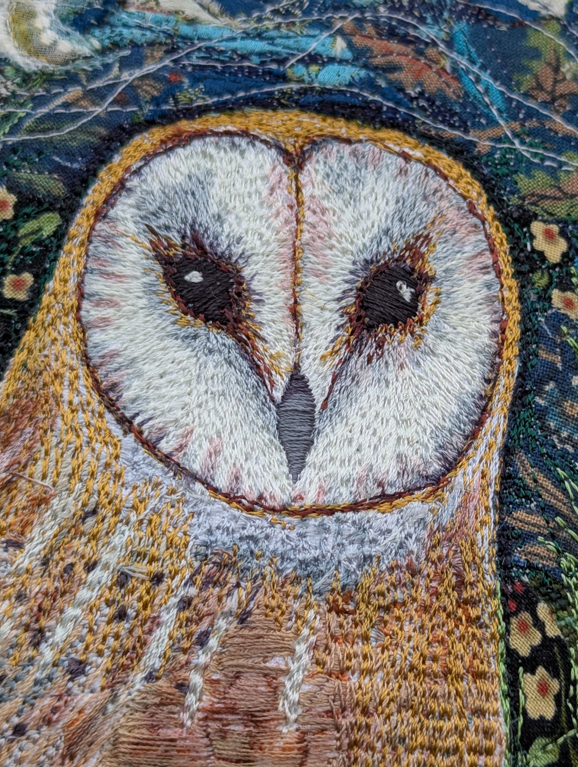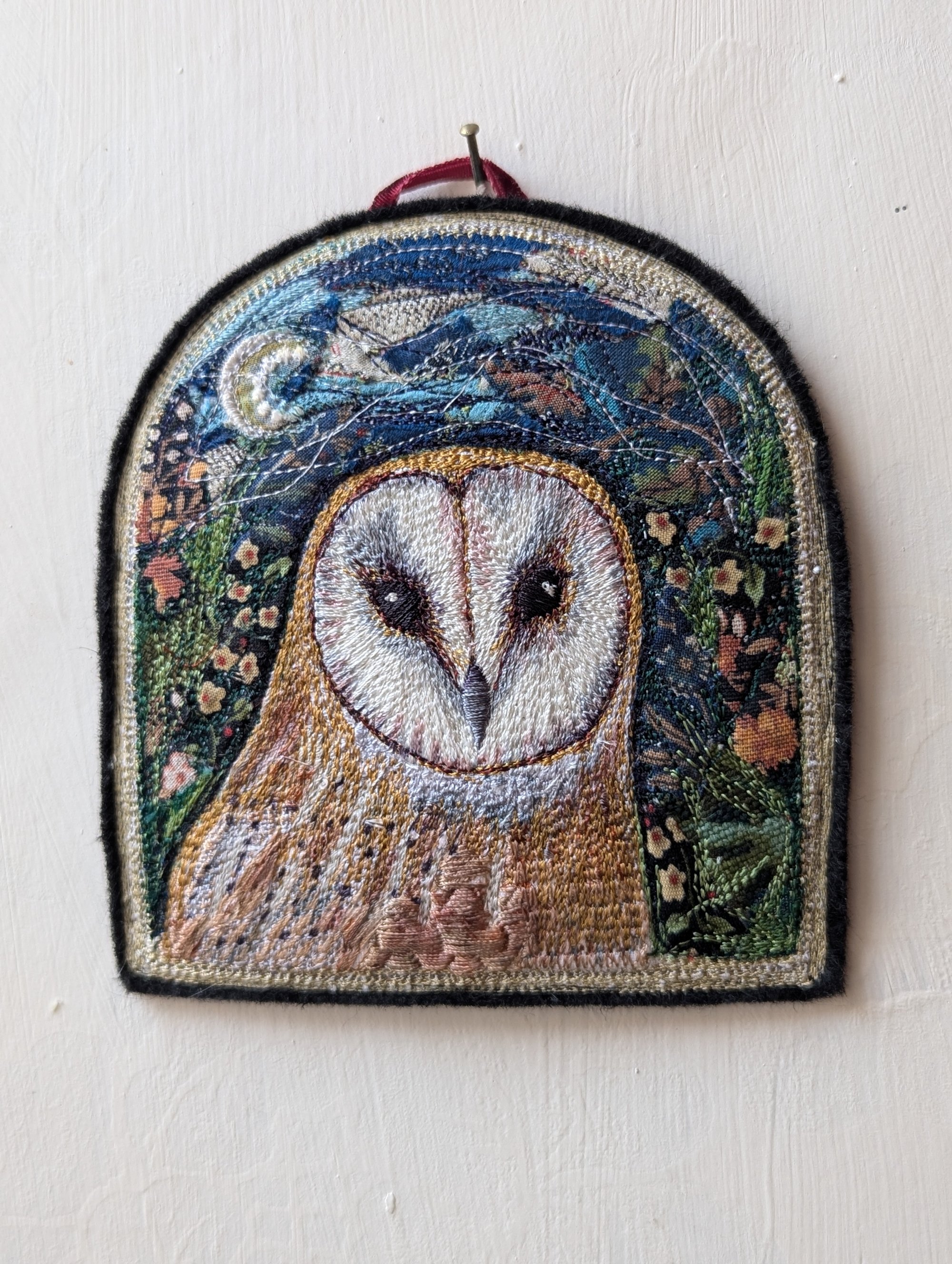 A favourite design- such a charming wise face. Barn Owl embroidery portrait with silk and cotton collage. Has the flavour of stained glass with its shape and rich colours. Bordered in continuous running stitch of silk rayon thread which has a lovely sheen. Slightly raised and backed with felt and cotton. Has a ribbon hanging loop or could be framed. Measures approx 12cm by 10.5cm. Keep out of direct sunlight and clean with a soft brush.