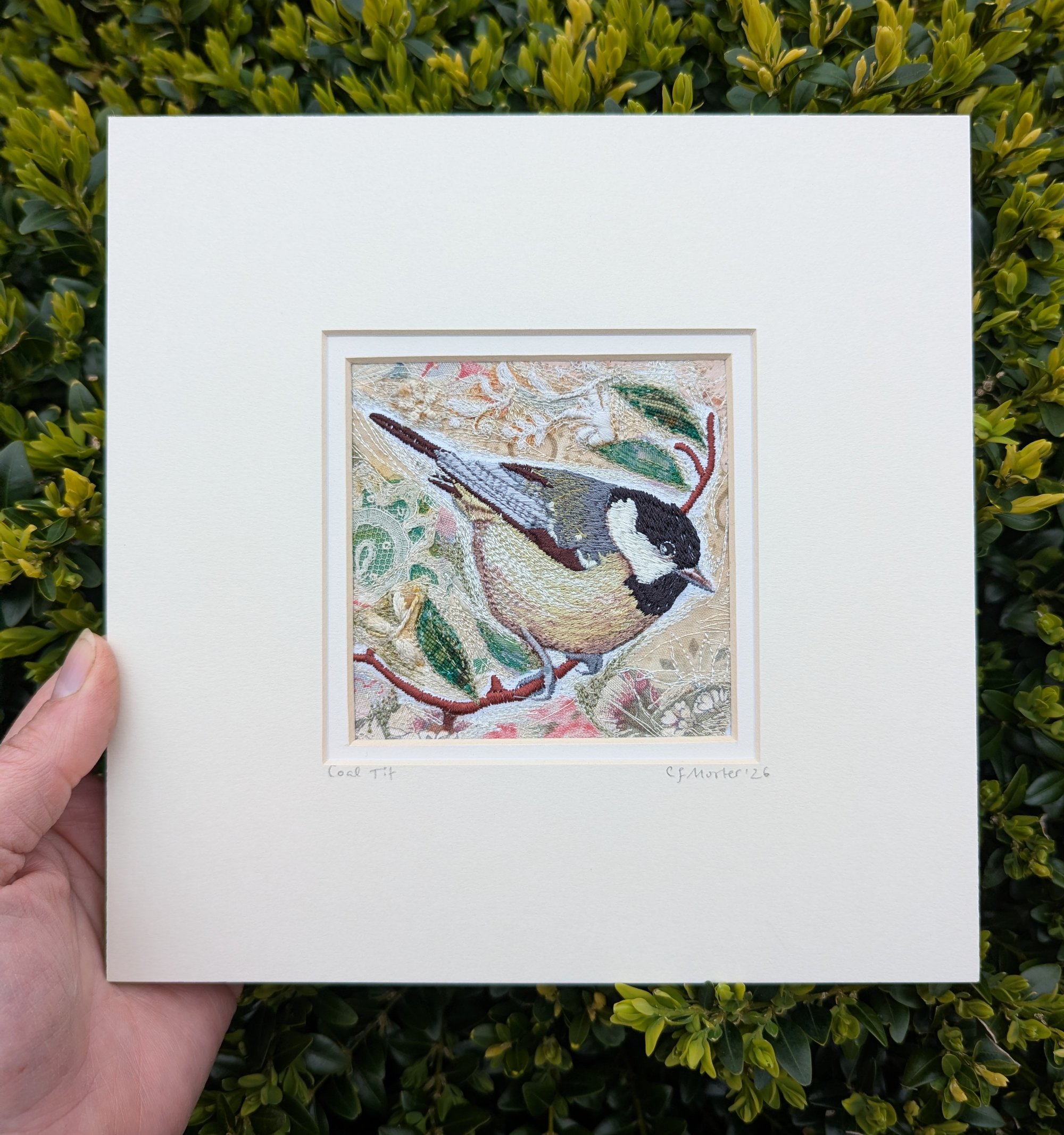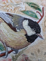 The sweet little Coal Tit - humbler than the larger Great tit and the bright Blue tit. An embroidery of this little bird with a muted pastel coloured collage background of printed antique cotton, silk and lace. Over stitched with silk rayon thread which catches the light beautifully. Image size 100mm by 100mm. Double mounted in antique board. Total mounted size 205mm by 205mm. Hang away from direct sunlight.