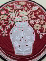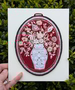 I love the contrast of red and white, often seen in historical textile art of the late 19th and early 20th century. This is on rich deep red velvet. A collage of embroidered white cotton and tiny whitework embroidered flowers. A machine embroidered frame of continuous white silk rayon thread. Backed with black felt and cotton. Measures approx 17cm by 13cm. With hanging loop or would look good framed. Keep out of direct sunlight and dust with a soft brush. Displayed on mount board using nano tape and should peel away easily.